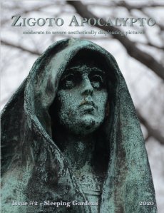 TITLE: Zigoto Apocalypto #2 FORMAT: 8.5" x 11" PAGES: 88 DETAILS: Full Color, professionally printed, perfect bound, first printing, 50 copies, hand-numbered. PRICE: $25 shipped via USPS (mainland USA only, for international, please request a new total) YEAR: 2020 DESCRIPTION: Zigoto Apocalypto #2, "Sleeping Gardens", is now in hand and ready to ship! This issue is more than double the size of #1, and is chock full of hand-picked cemetery photography from over 30 years of international travel. This issue also includes stories, poems and art from Zigoto Apocalypto, NFP, Arthur Storrs, Nathan Harlan, Dylan Bell, and Kyotopunk. Get a copy while you still can! |